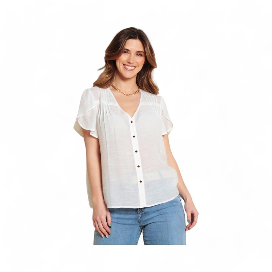 Blusa de manga corta en color blanco con un diseño sólido y botones en el delantero, ideal para un estilo casual y elegante. Confeccionada en una mezcla suave de rayón y poliéster para mayor frescura y comodidad.