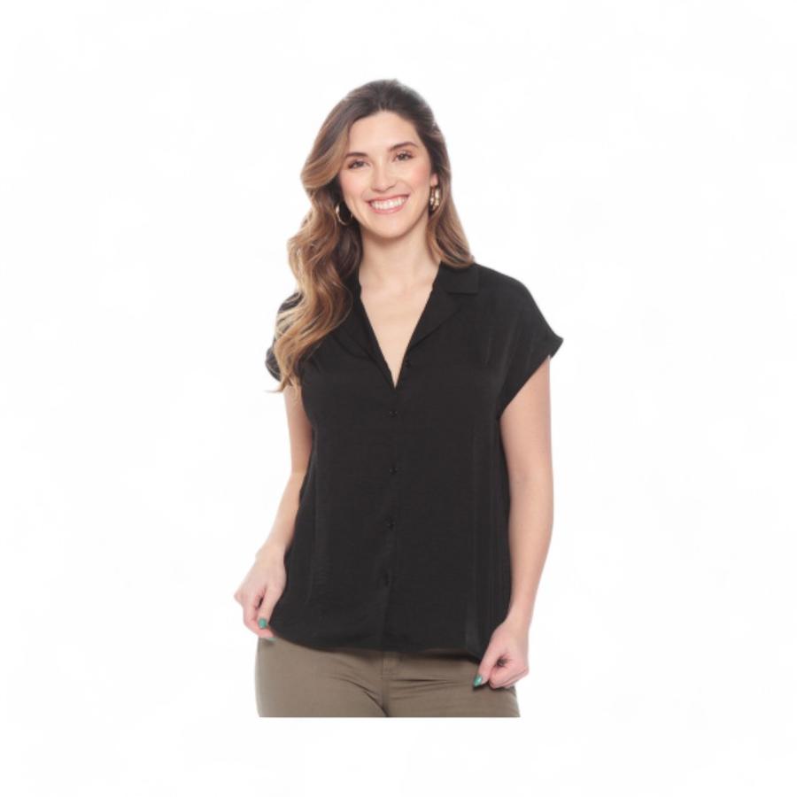 Blusa sin mangas en color Negro, de diseño sólido y abotonada al frente, ideal para un look fresco y elegante. Confeccionada en 100% poliéster, es ligera y cómoda, perfecta para días cálidos o para combinar en capas.