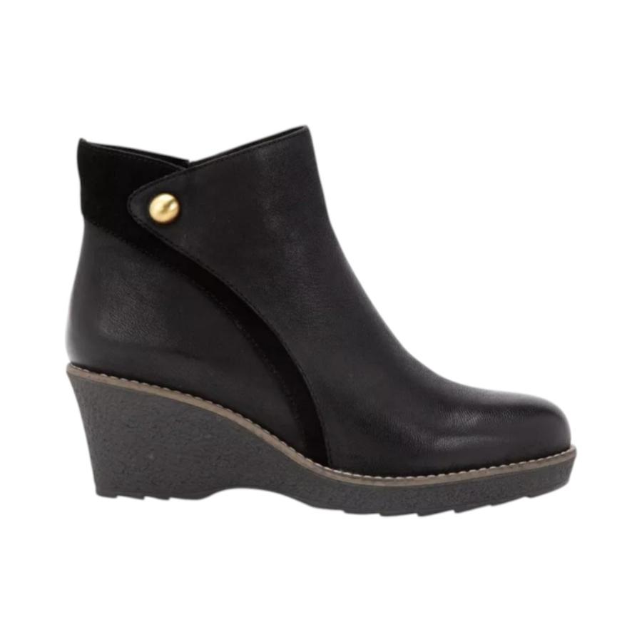 Inspírate en la elegancia rústica con el botín Leda, diseñado en cuero envejecido negro que evoca la calidez de las casas de campo inglesas. Su suela terraplén de 6 cm aporta altura y confort, mientras que los detalles metálicos y las texturas contrastantes le otorgan un estilo único y sofisticado. Ideal para caminar con confianza y dar un toque chic a tus outfits diarios.