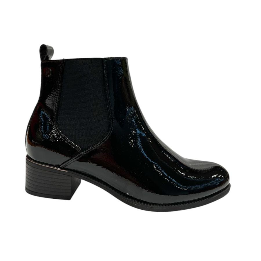 Elegancia y confort se unen en el botín Via Rosmini modelo Massi. Su acabado en charol y taco bajo lo convierten en un calzado ideal para usar todo el día con estilo.