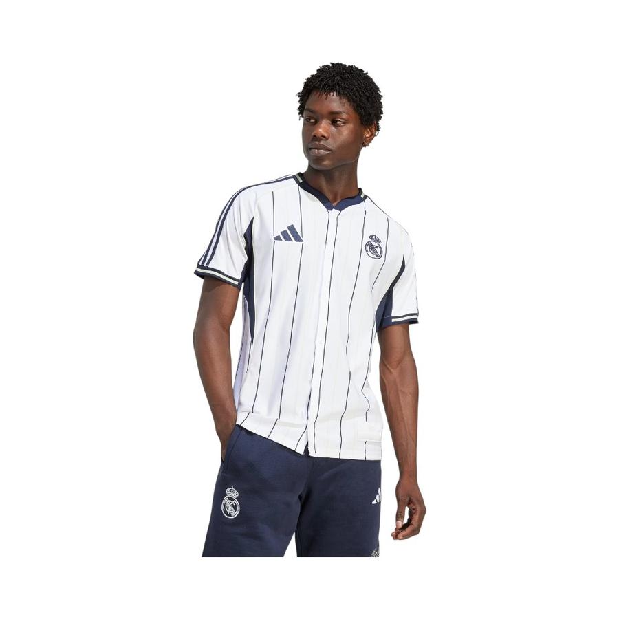 Un estilo único que fusiona dos pasiones deportivas. Esta camiseta Adidas del Real Madrid toma inspiración del béisbol con su cierre de botones y finas rayas, integrando a la vez la esencia del fútbol clásico. Con el escudo bordado de Los Blancos, es perfecta tanto para alentar al equipo como para lucir un look deportivo y auténtico en tu día a día.