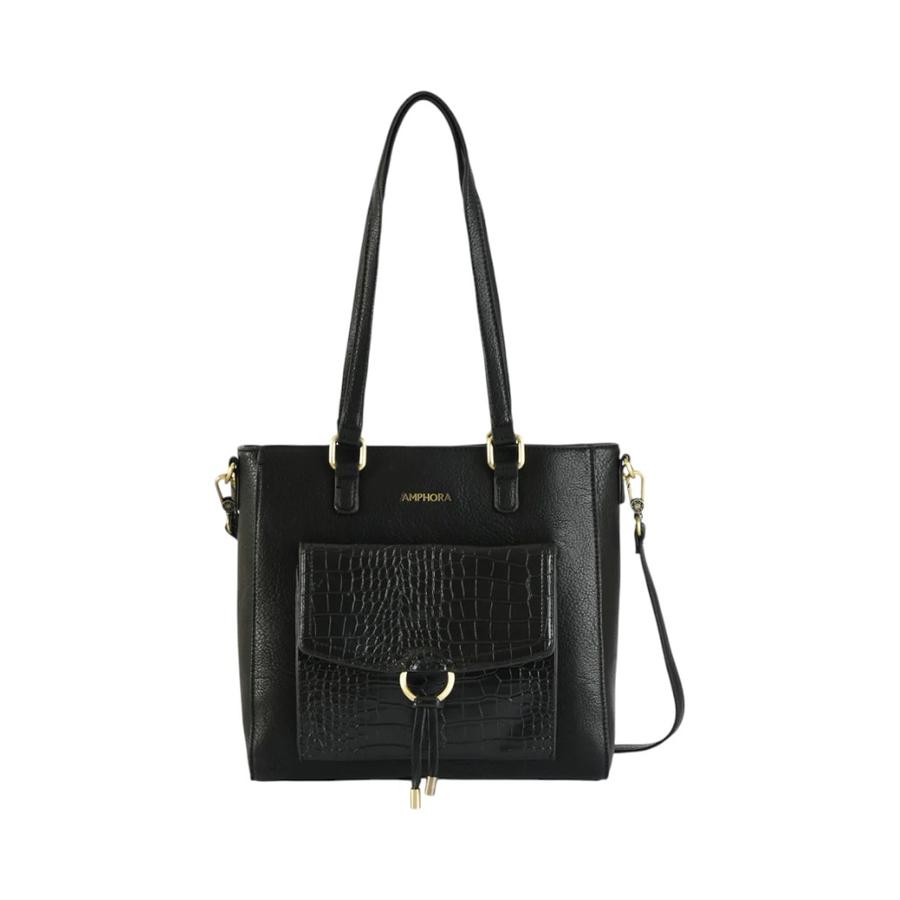 La cartera Amphora Lya es ese básico elegante que nunca pasa de moda. Confeccionada en ecocuero negro con textura grano, combina un diseño estructurado con la funcionalidad que necesitas para el día a día o para complementar tu look de oficina. Sus tres divisiones y múltiples bolsillos permiten organizar tus pertenencias con facilidad, mientras que los detalles metálicos en dorado viejo le dan un acabado sofisticado y atemporal. Sus dos asas firmes y correa ajustable e intercambiable la hacen práctica y versátil para cada ocasión.