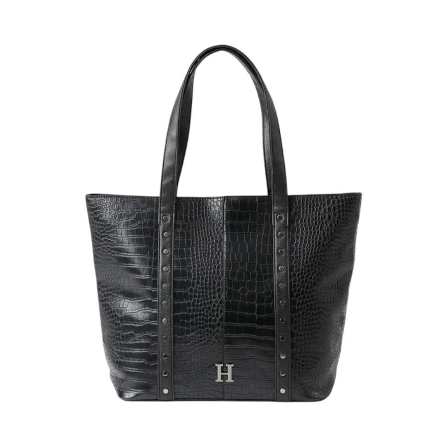 Complementa tu estilo con la cartera Humana Alena en elegante ecocuero negro con textura tipo cocodrilo. Su diseño moderno con tachas en el frente y herrajes en metal plateado oscuro aporta un toque sofisticado. Incluye dos asas lisas para usarla cómodamente al hombro y un interior espacioso con compartimentos prácticos para mantener tus pertenencias organizadas.