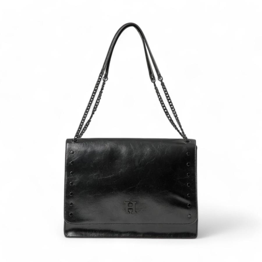 La cartera Melilla en negro es el accesorio ideal para quienes buscan un toque audaz y versátil. Diseñada en ecocuero, cuenta con un doble asa ajustable que permite llevarla como cartera de hombro o cruzada. Su solapa con imán y detalles de tachas en los costados le dan un estilo moderno y atrevido. En su interior incluye un bolsillo con cierre, y los detalles en metal negro aportan elegancia y resistencia.