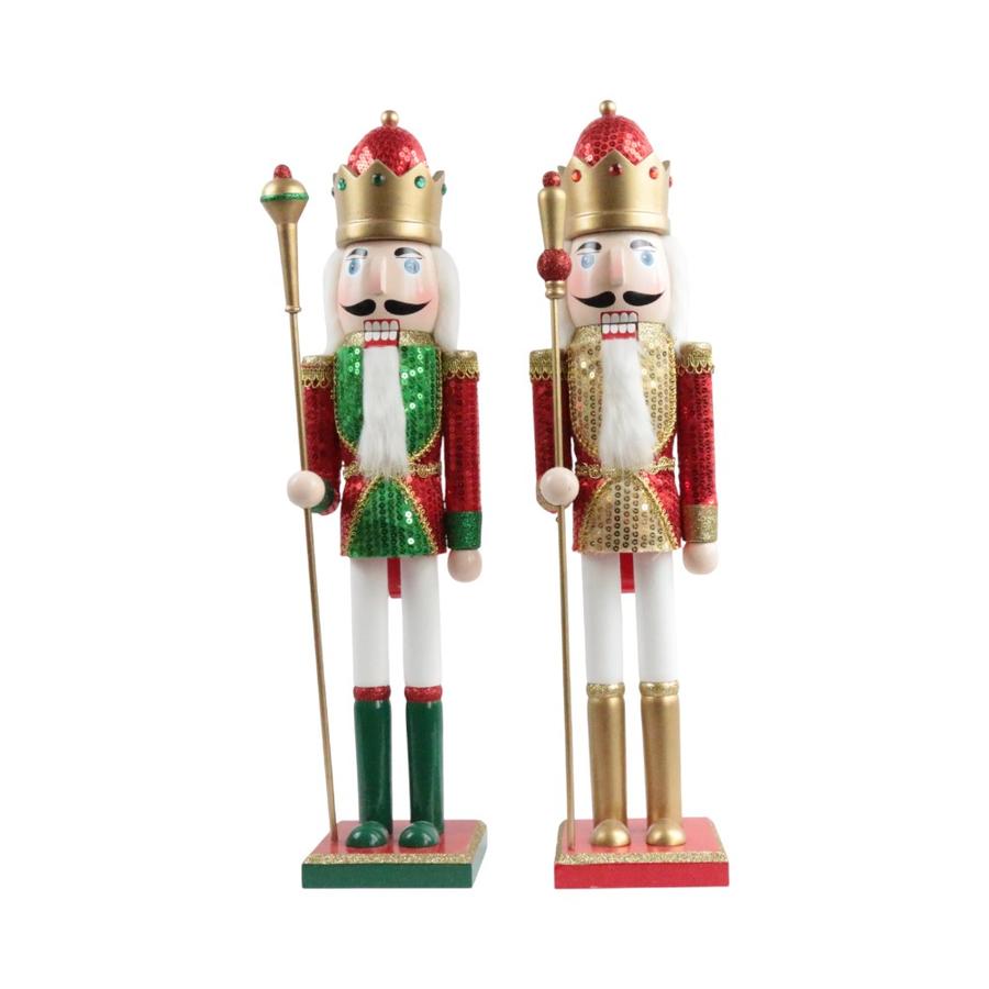 Añade un toque de lujo y brillo a tu decoración con este Cascanueces Navideño Coleccionable. Esta figura de madera viene en una unidad al azar de un set de reyes, destacando por sus trajes de lentejuelas brillantes en color rojo y verde. Con su imponente altura y detalles dorados, es el adorno perfecto para repisas, estantes o como parte de un centro de mesa festivo.