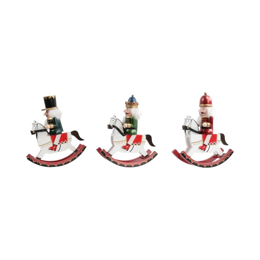 Añade un toque clásico y festivo a tu decoración con este Cascanueces Navideño Balancín Coleccionable. La figura de madera viene en una unidad al azar de un set de soldados y un rey montados en un caballito de balancín. El diseño metalizado y pintado a mano en colores tradicionales (rojo, verde y azul) es perfecto para colgar en el árbol o decorar una repisa, evocando la magia de la Navidad.