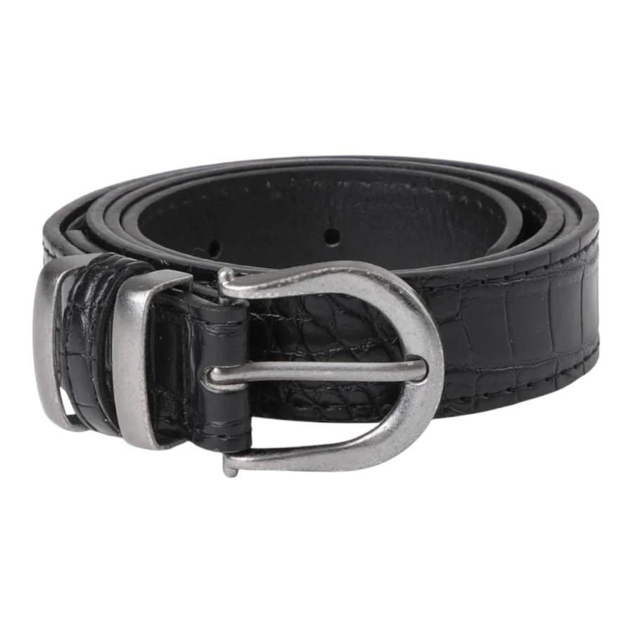Dale un toque de sofisticación a tus looks con este cinturón lleno de detalles distintivos. Confeccionado en ecocuero negro, su textura de efecto cocodrilo aporta un aire de lujo y modernidad. Destaca por su elegante hebilla pequeña y redondeada en metal plateado opaco, complementada por tres pasadores decorativos que enriquecen su diseño. Con 110 cm de largo, es la pieza perfecta para añadir estructura y estilo a pantalones formales o jeans casuales.