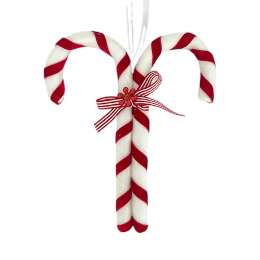 Añade un toque tierno y festivo a tu decoración con este adorno de Bastones Matiz. El diseño presenta dos bastones de caramelo unidos, con una textura afelpada suave en color blanco y rayas de terciopelo rojo. Un lazo de rayas y bayas decorativas une los bastones, convirtiéndolo en un acento adorable para colgar en puertas, ventanas o en tu árbol.