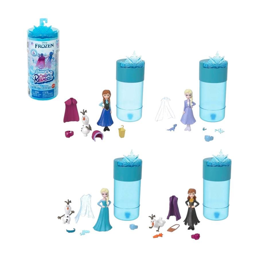 Sumérgete en la magia de Frozen de Disney con las Muñecas Snow Color Reveal™. Inspiradas en los queridos personajes de las películas, cada paquete esconde 6 sorpresas mágicas. Las niñas comenzarán la diversión abriendo el cilindro y descubriendo una muñeca misteriosa cubierta con el revestimiento de Color Reveal™, junto con 3 bolsas que esconden sorpresas adicionales.