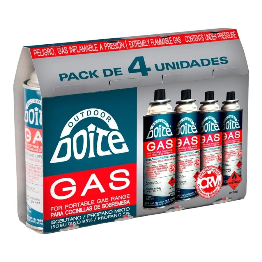 Pack de 4 Cartuchos de Gas 227 g Doite Este pack incluye 4 cartuchos de gas Doite de 227 gramos cada uno, ideales para cocinillas de sobremesa. Con un sistema de seguridad anti-explosión y una mezcla de isobutano y propano, estos cartuchos ofrecen una solución segura y eficiente para tus necesidades de cocción al aire libre. Características: - Cantidad: 4 unidades - Peso por cartucho: 227 g - Sistema de Seguridad: Anti-explosión del envase (CRV) - Recargables: No - Composición: Isobutano 95%; Propano 5%