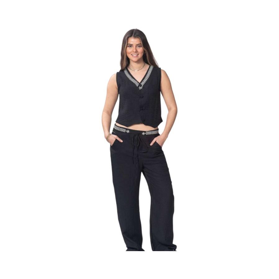 Pantalón Mujer Bannana Club Semi Lino Bordado Negro