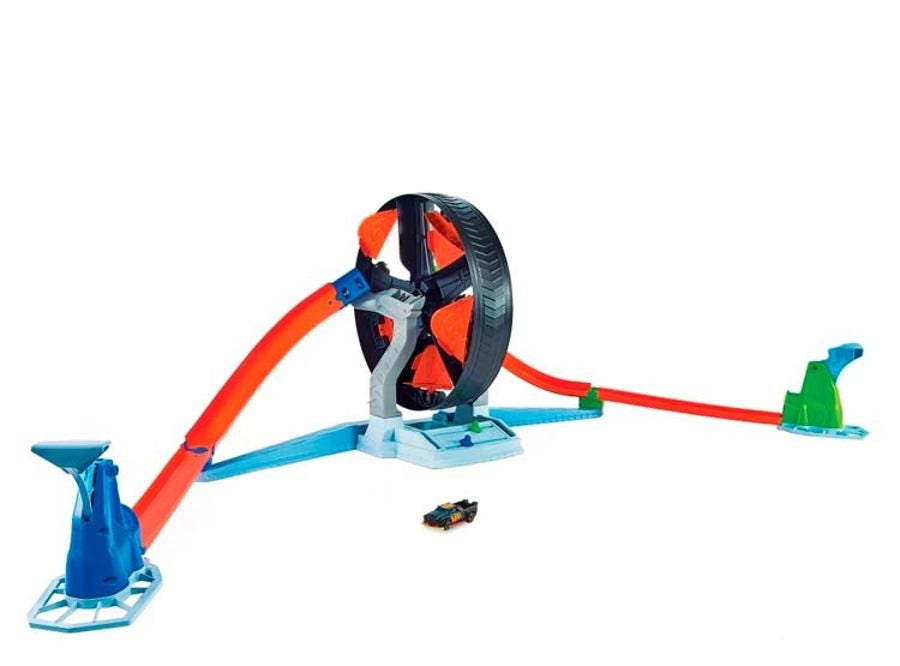 Incluye: Dos lanzadores, una rueda giratoria, dos vehículos Hot Wheels®, una pista e instrucciones.