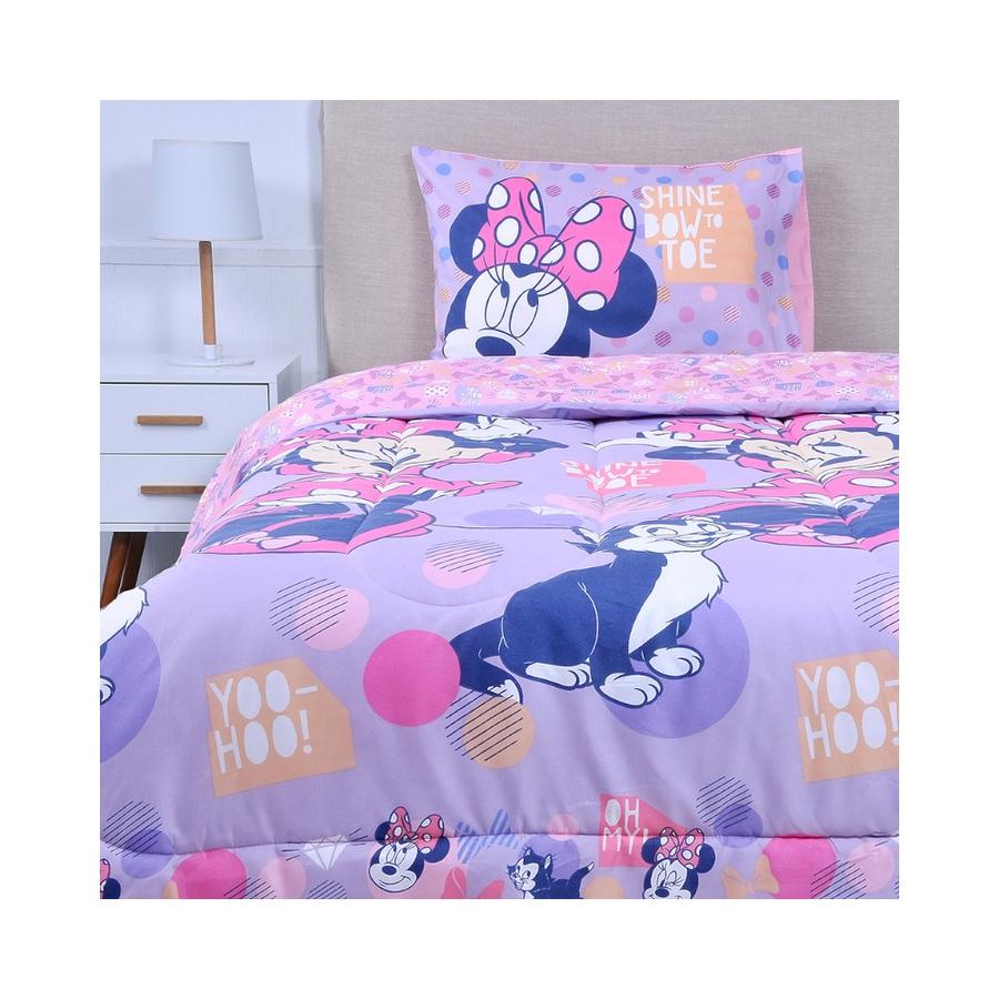 Dale un toque encantador a tu habitación con el plumón Minnie Shine en color lila para 1.5 plazas. Su diseño delicado y fresco crea un ambiente acogedor y alegre. Incluye una funda de almohada que combina a la perfección para un juego completo y cómodo.