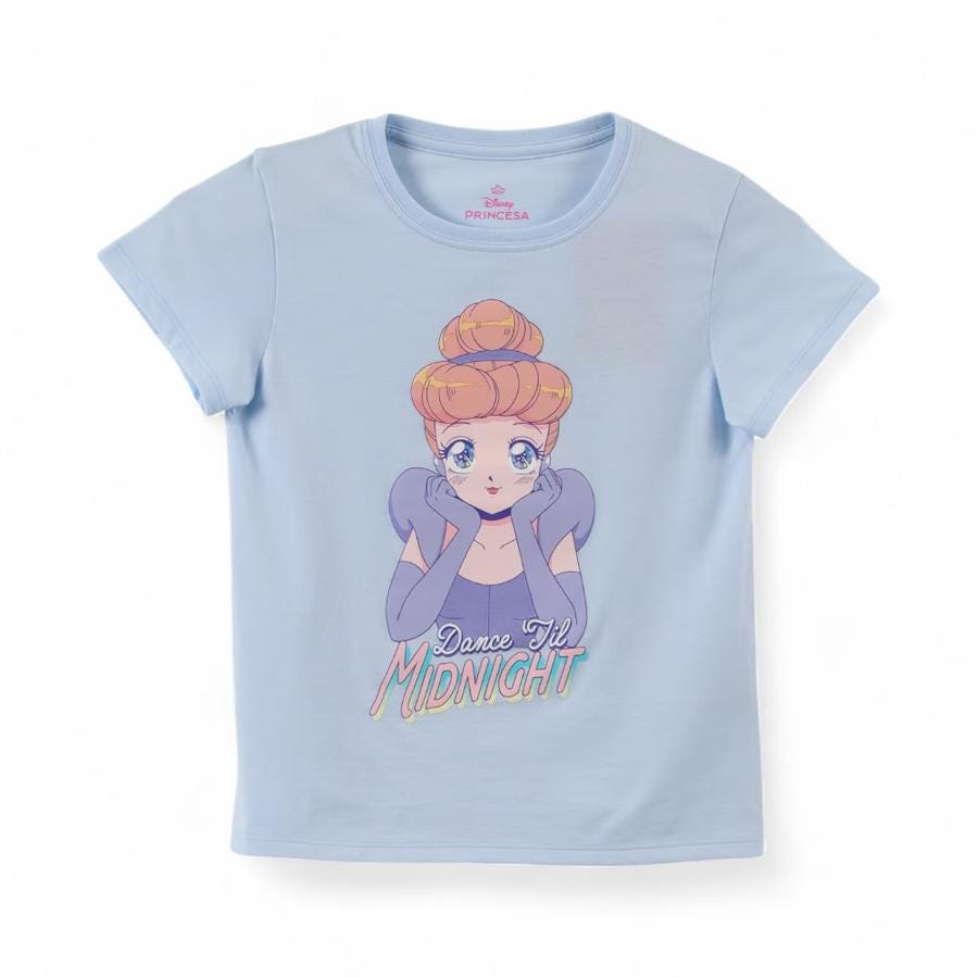 Celebra la magia del cuento de hadas con esta encantadora polera de manga corta, inspirada en la querida Princesa Cenicienta. Con un diseño que presenta a Cenicienta y la divertida frase "Dance til midnight," esta polera es perfecta para que las pequeñas disfruten de sus días con estilo y un toque de fantasía.