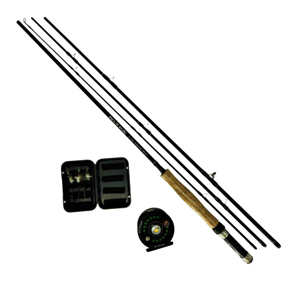 Combo Blue Fox para la pesca con mosca, ideal para la pesca en agua dulce y la captura de trucha y lobina. Diviértete con tu familia pescando truchas, lobinas o cualquier otra especia que se encuentre en los lagos de tu zona con este combo listo para usarse.