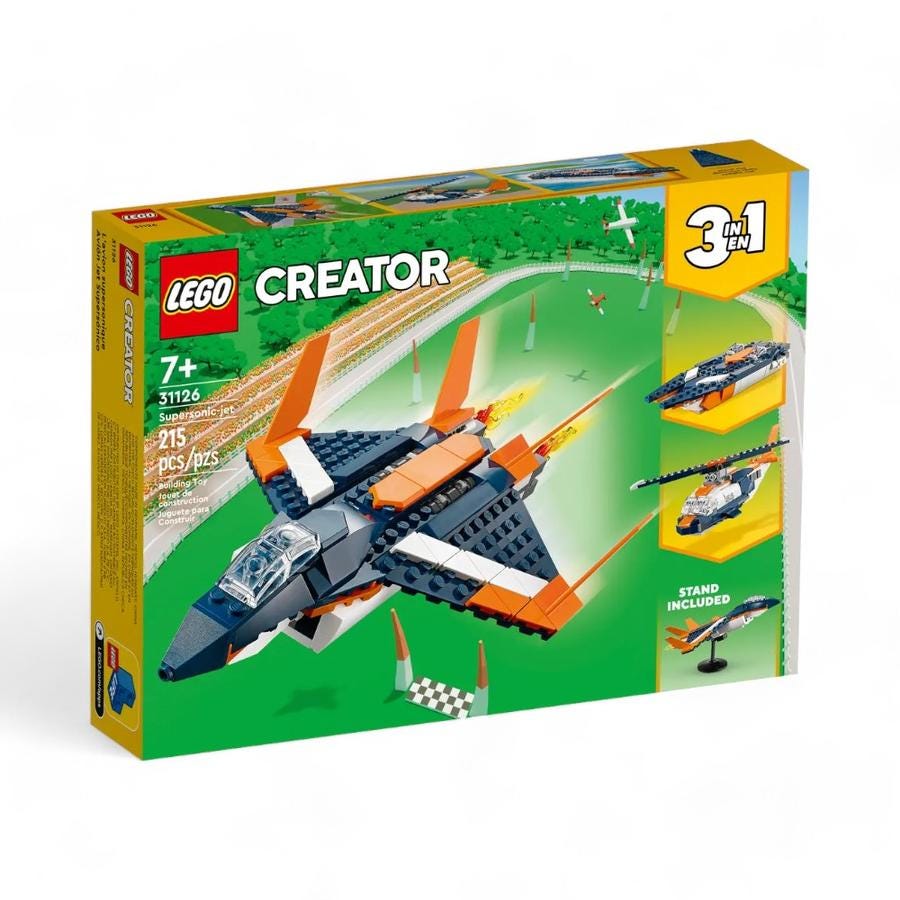 Prepárate para emocionantes sesiones de juego aéreo y acuático con el set LEGO® Creator 3 en 1 Reactor Supersónico (31126). Diseñado para niños de 7 años o más, este set incluye un impresionante reactor de carreras aéreas ultrarrápido con cabina, tren de aterrizaje retráctil, tobera que expulsa llamas y una base para exhibirlo. Los pequeños constructores podrán disfrutar de la construcción de tres modelos de gran realismo: un avión a reacción, un helicóptero y una lancha motora.