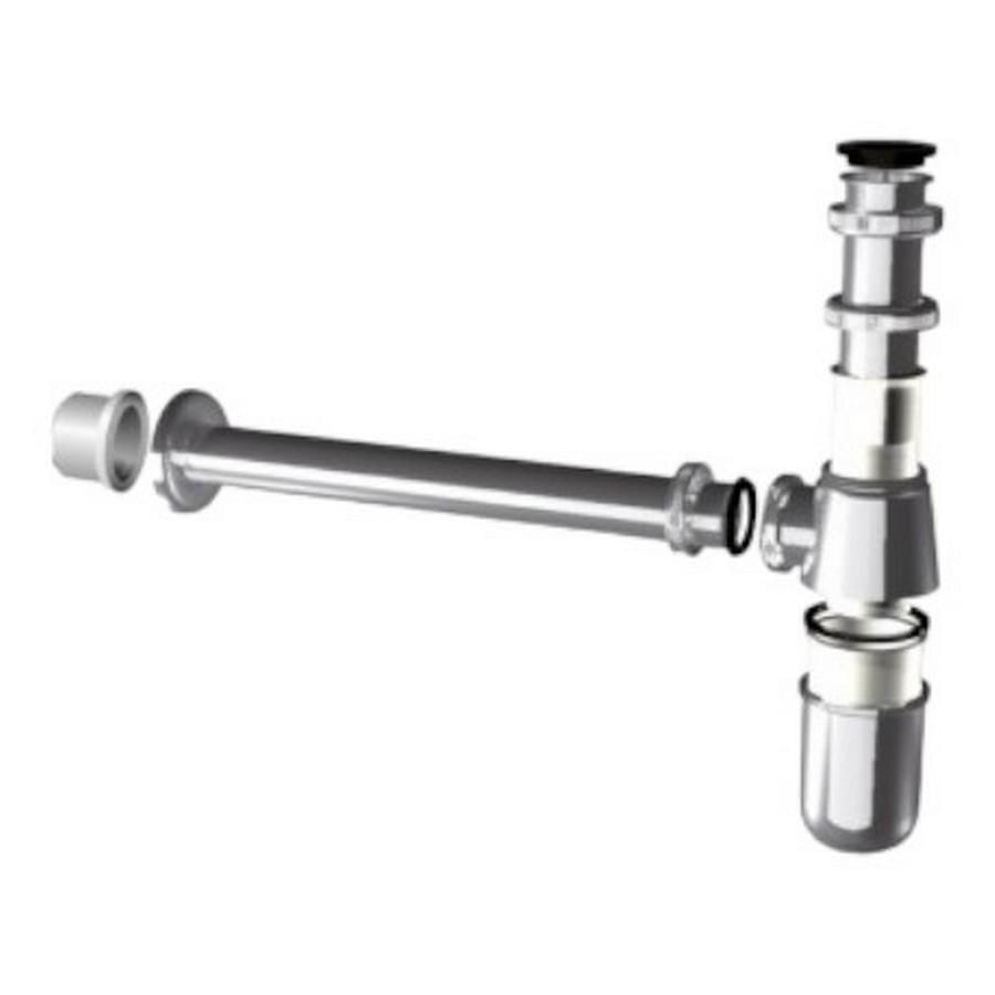 Sifón metálico cromado diseñado para lavatorios, equipado con un vaso de registro que facilita su limpieza y mantenimiento.