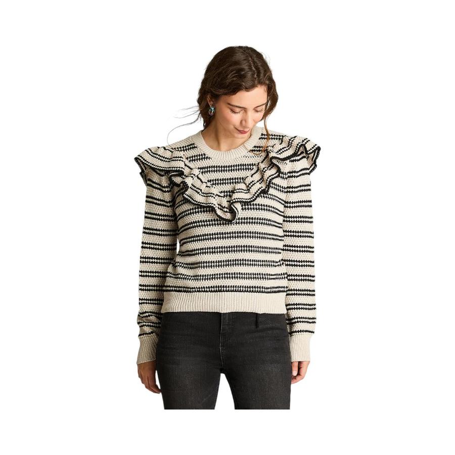 Sweater de mujer con vuelos y diseño listado, ideal para días frescos. Su estilo romántico y femenino se complementa con un tejido suave y cómodo que lo convierte en una prenda clave para tu clóset de otoño.