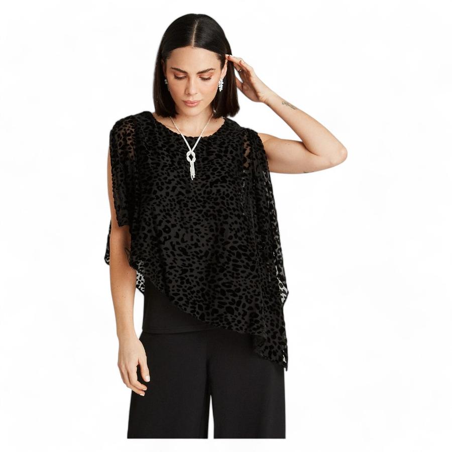 Esta túnica negra de manga corta y cuello redondo, parte de la colección Pre Party de Lorenzo Di Pontti, es la combinación perfecta de sofisticación y estilo moderno. Confeccionada en una mezcla de 75% viscosa y 25% poliamida, destaca por su tela fantasía con flock en un elegante animal print, ideal para ocasiones especiales o para elevar tu estilo diario.